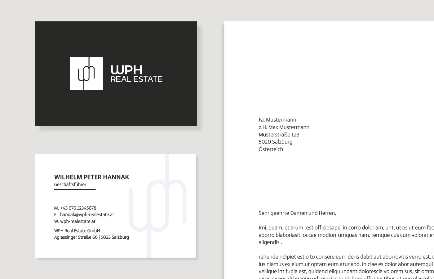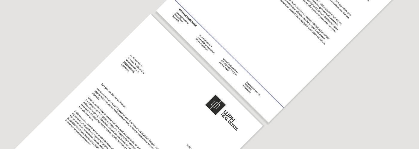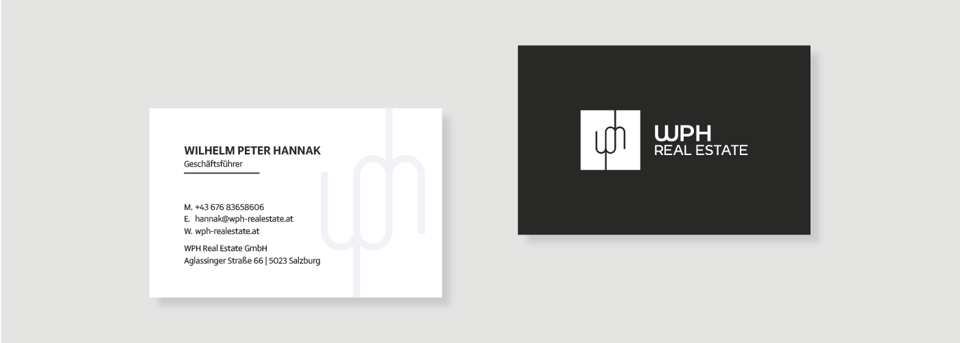 Die Markenentwicklung startete mit einem strategischen Workshop, in dem Kernwerte, Ziele und Vision definiert wurden. Der Name WPH Real Estate verdeutlicht Professionalität und Klarheit. Das drehbare Palindrom-Logo bietet ein starkes Wiedererkennungsmerkmal und spiegelt eine durchdachte, innovative Arbeitsweise wider. Anschließend wurde das Corporate Design sorgfältig ausgearbeitet und auf alle Kommunikationsmittel angewendet – von Visitenkarten über Landing Page bis zu Projektfolien. Hochwertige Materialien, klare Linien und ein elegantes Design sorgen für einen bleibenden Eindruck bei Kunden und Partnern.